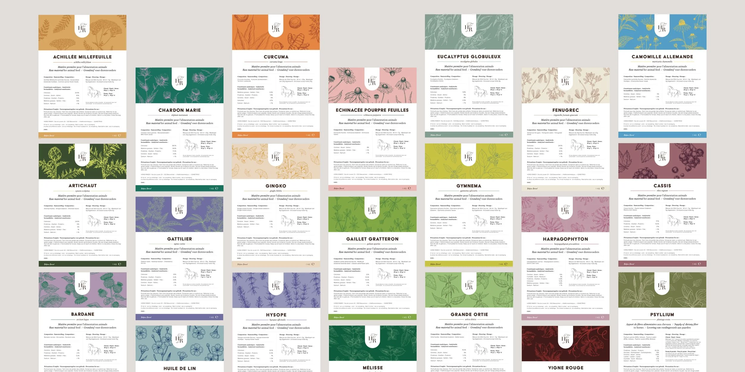 I designed the full range of packaging labels for their phytotherapy line. Creating 31 products required a wide, carefully balanced color palette,