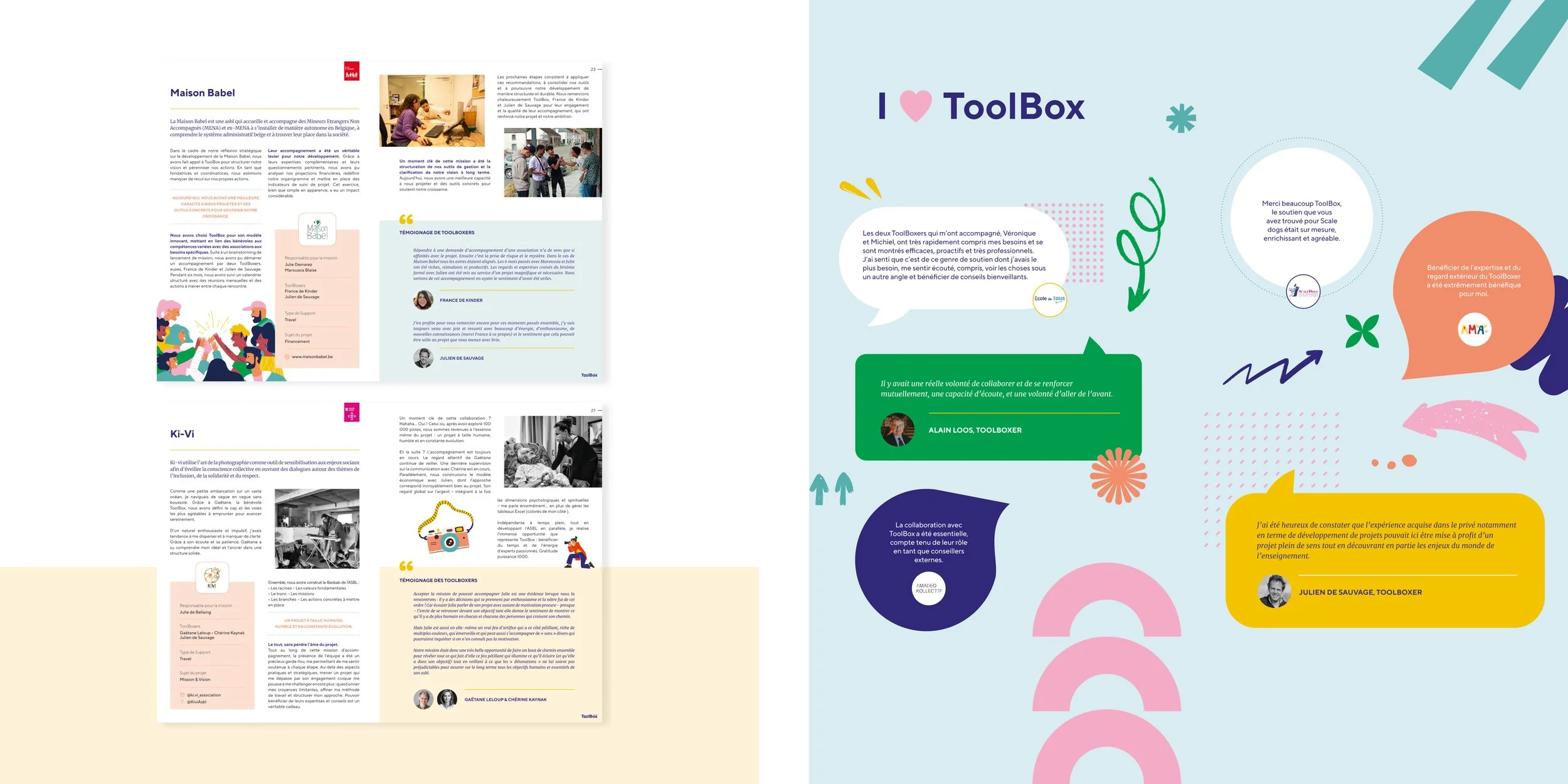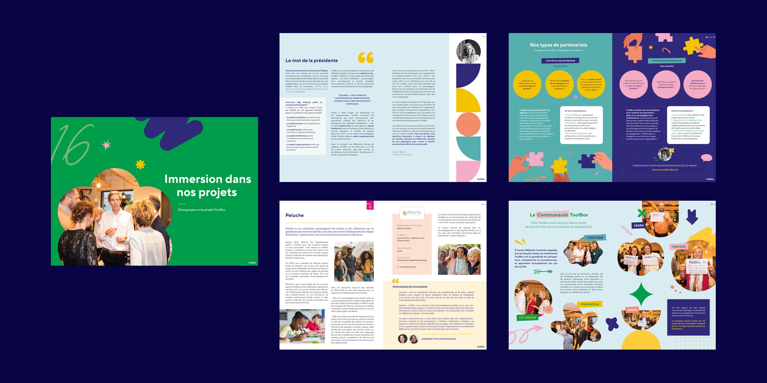For several years, I’ve been designing the annual report for the ToolBox association. Each year, I create new illustrations based on the visual identity I developed, in order to refresh the overall atmosphere and bring more diversity to the document. This year, in addition to the print version, we also created a digital version with a condensed selection of content.